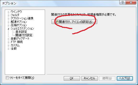 - Explzh のメインメニューから、「ツール」 - 「オプション」- 「シェルエクステンション」 - 「関連付け設定」 と行き、[関連付け、アイコンの設定] ボタンをクリックします。