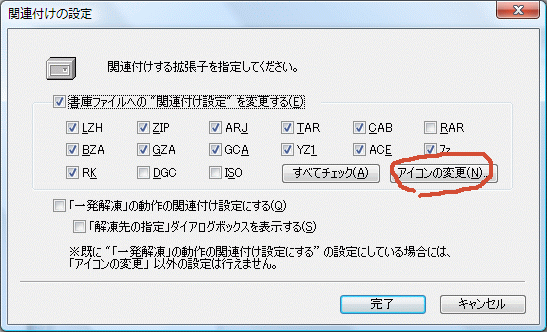 を変更する」 チェックがなければチェックしして、関連付けする書庫の種類にチェックします。