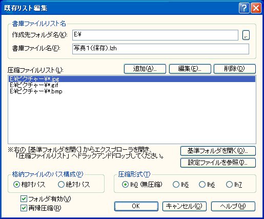 既存の圧縮ファイルリストの編集をおこないます。 ※ 編集された内容は Explzh の存在するフォルダ内に Explzh.ini として保存されます。 各項目のヘルプを表示するには,目的の項目をクリックしてください。